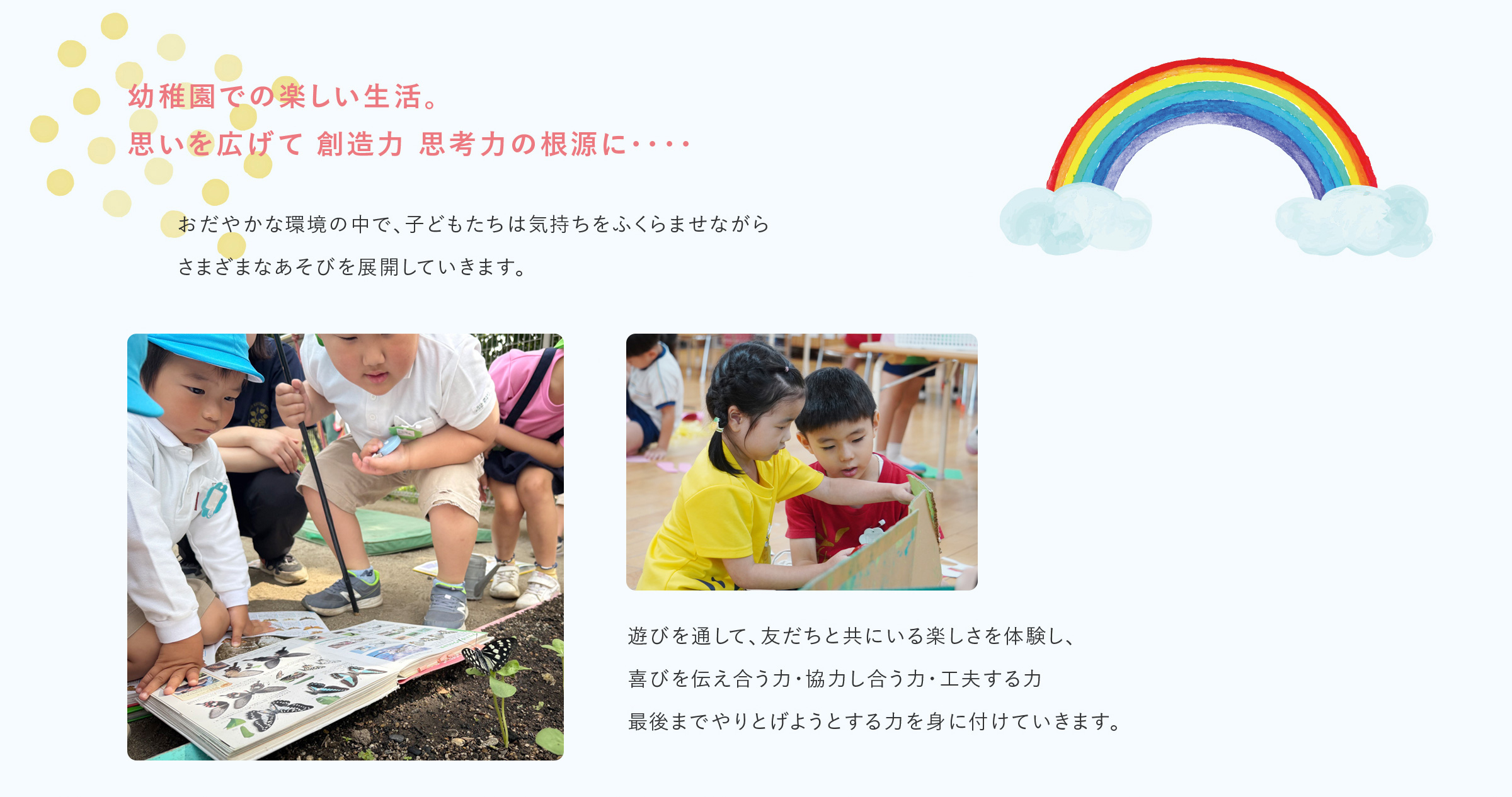 遊びを通して、友だちと共にいる楽しさを体験し、喜びを伝え合う力・協力し合う力・工夫する力最後までやりとげようとする力を身に付けていきます。